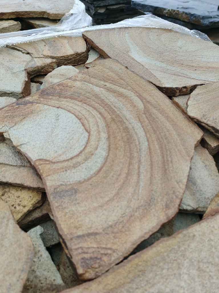 Песчаник жёлтый с разводами - для работ по облицовке стен, фундаментов, заборов.