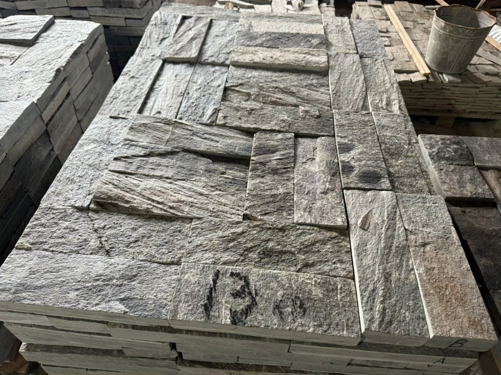 - необработанные плитки толщиной - 1,5-3 см. - по 30м2 на 1 поддоне - применяется в для облицовки вертикальных поверхностей, плитки от 2 до 3 см., благодаря цельной структуре и прочности камня, также можно применять для мощения дорожек, но только на бетонное основание.